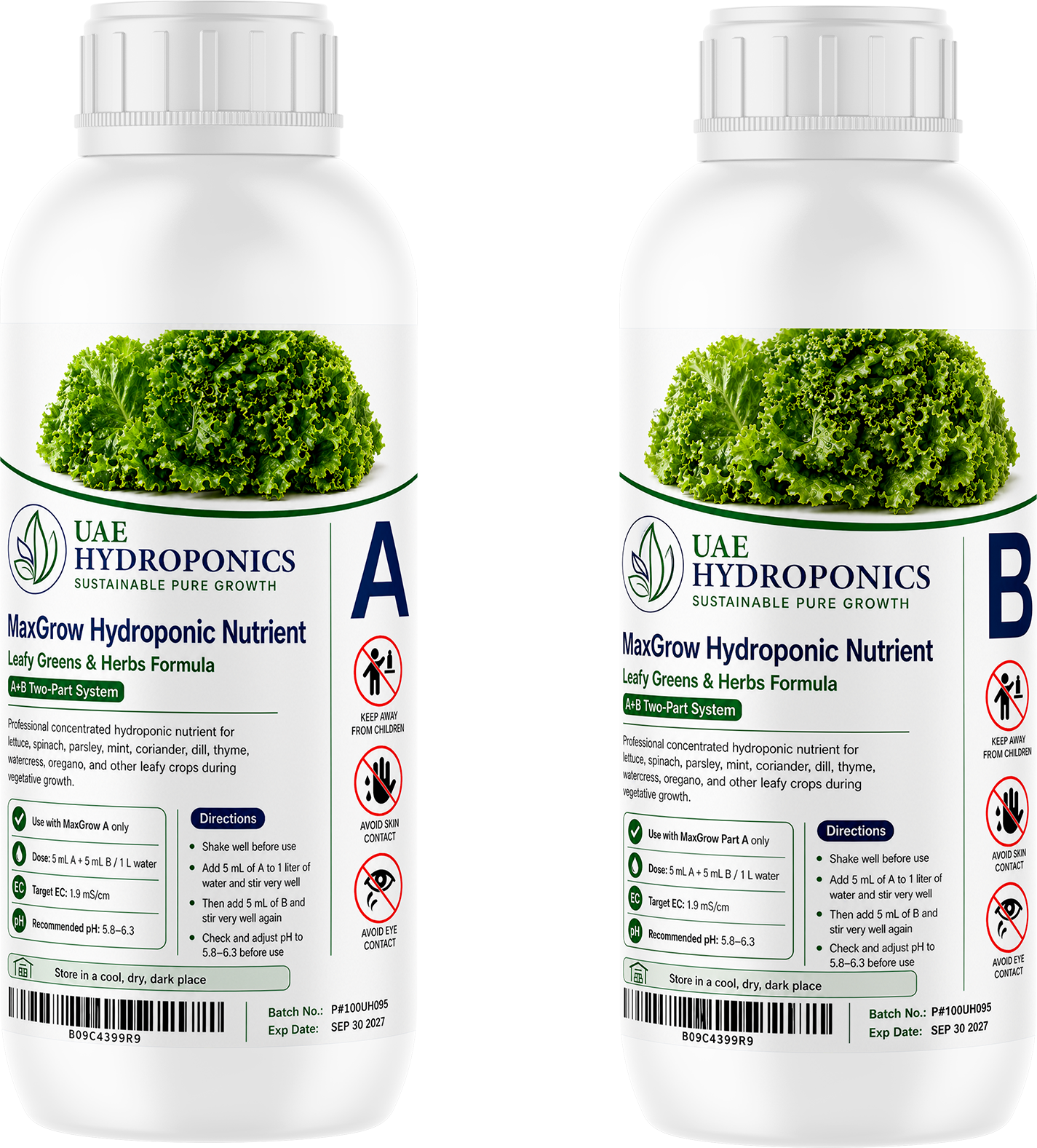 MaxGrow Hydroponic Nutrient Solution for Leafy Plants, a premium, pH-buffered formula designed to optimize the vegetative growth phase of your plants. Available in 1 Liter and 4 Liter sizes, MaxGrow ensures your leafy greens receive the precise nutrients they need for robust development.